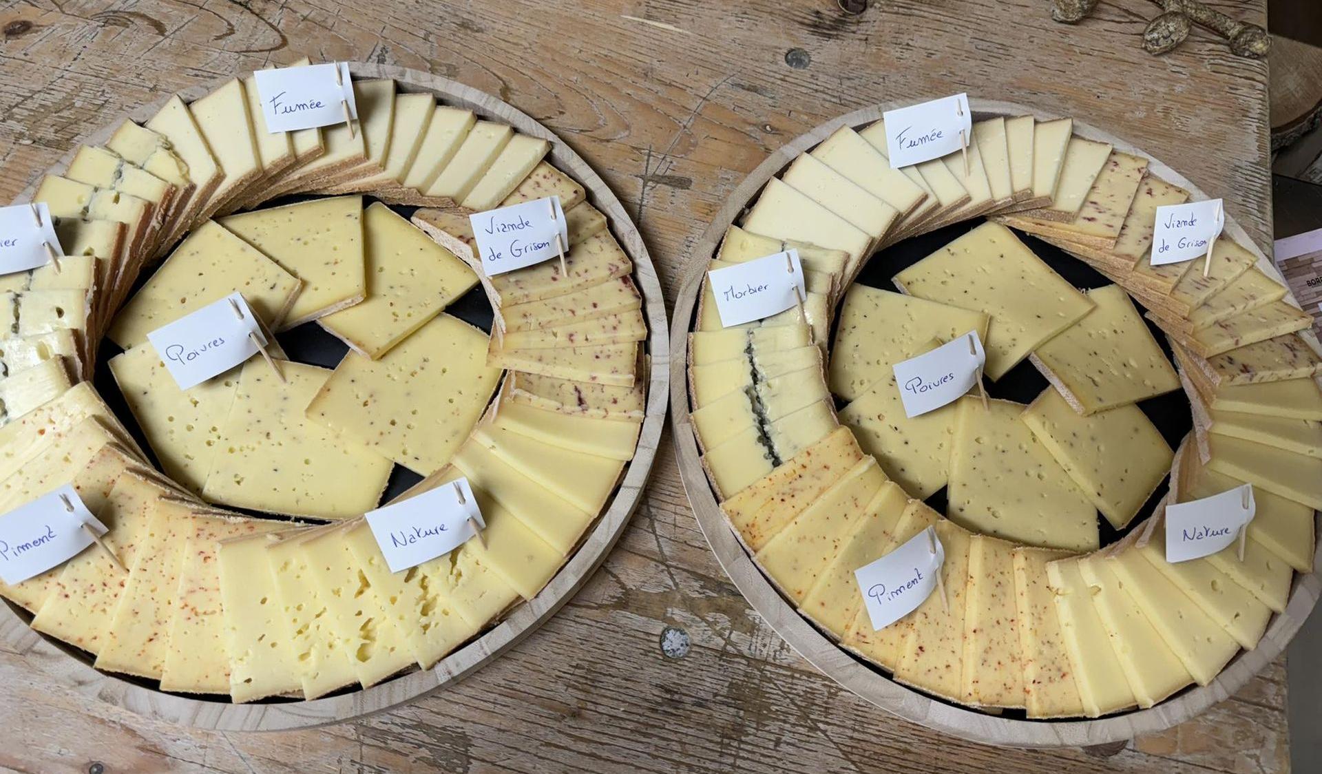 Nos plateaux sont composés d'une sélection variée de fromages, accompagnée de nos confitures, notre sirop et de fruits secs.